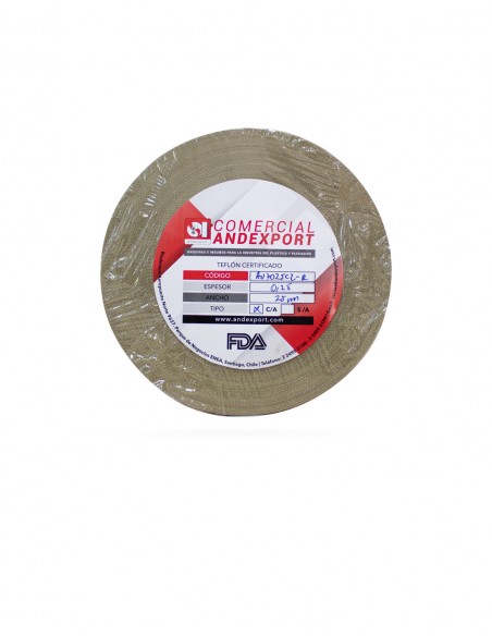 Teflón con  adhesivo en base a fibra de vidrio impregnada con PTFE, superficie única tratada y recubierta con resistencia a altas temperaturas, el adhesivo es testeado para soportar altas presiones de trabajo. Liner amarillo de PVC está diseñado para proteger la superficie adhesiva y mantener su vida útil. La línea de teflón de Comercial Andexport utiliza DOW CORING SILICONE ADHESIVE la que garantiza su resistencia  a las altas temperaturas.Aplicaciones: Para termoselladoras, como protección al calor, para el aislamiento eléctrico resistente al calor, etc...